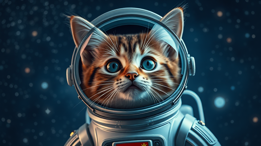 A highly detailed, ultra-high-definition image of an adorable cat wearing a futuristic space suit, complete with a transparent helmet that reflects the stars. The cat's bright, curious eyes peek through the visor, capturing its fascination with the vast, star-studded galaxy surrounding it. The suit, sleek and modern, is adorned with tiny glowing panels and emblazoned with a small, colorful emblem. The scene conveys a sense of whimsical adventure, as if the cute feline is embarking on a cosmic journey.