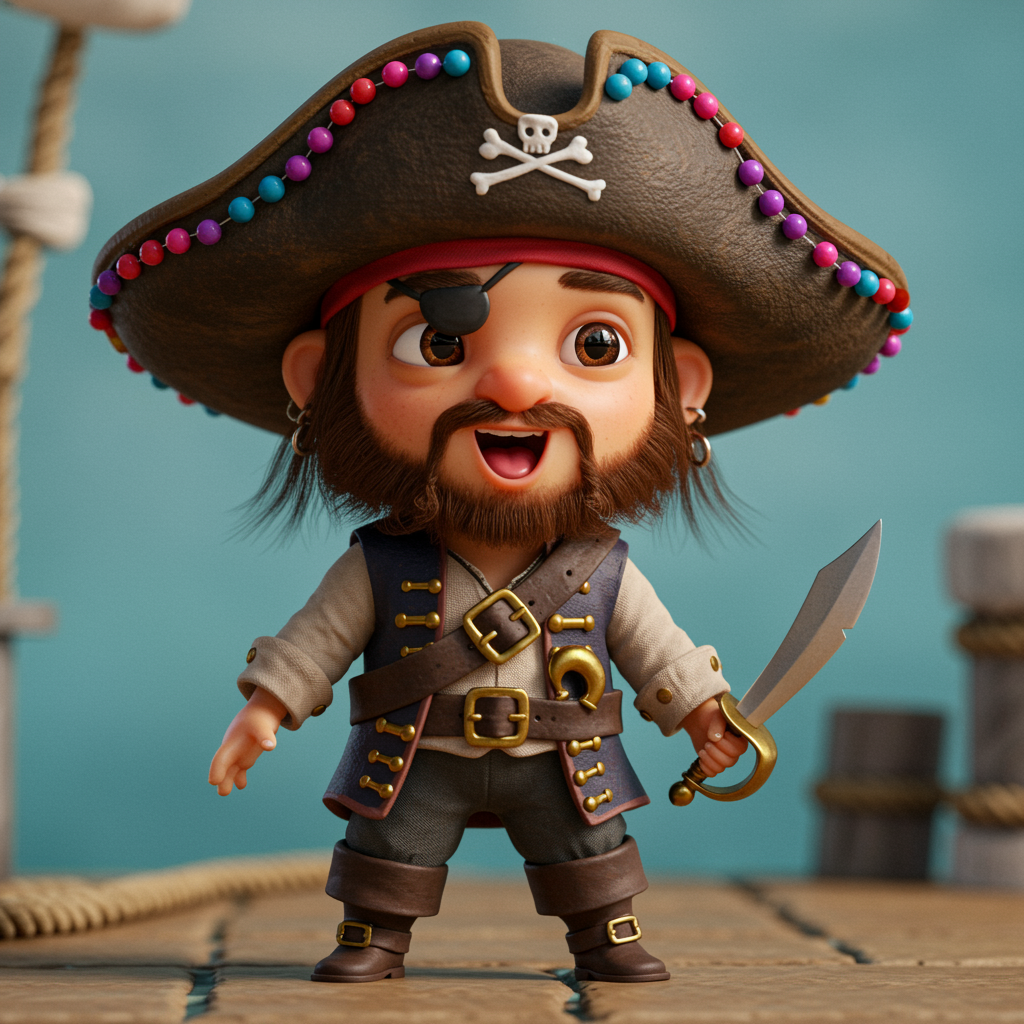 Adorable miniature pirate with a playful expression, tiny version of a famous swashbuckler, wide-brimmed hat with colorful beads, exaggerated features like big eyes and small hands, wearing a miniature pirate outfit with a tiny sword, adventure-ready in a whimsical maritime setting, mischievous yet charming demeanor.