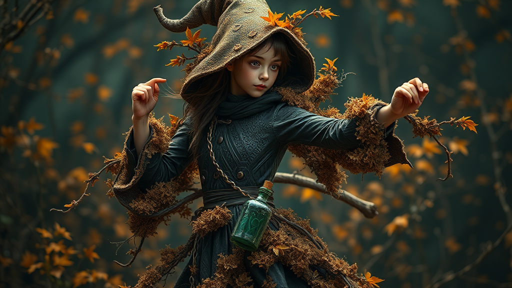 A full-body, dynamic dance pose in slow motion featuring a slightly eerie young girl wizard composed of autumn foliage and plants. Her cloak, an intricate blend of brown moss and dark leather, forms elaborate patterns, while a bottle of toxic spellcraft hangs at her side. The dark, moody universe backdrop is filled with a rich tapestry of autumnal-colored plant matter, rendered in exquisite detail. This digital art piece is captured in ultra-high quality, at 16k resolution, with exceptional sharpness. Her face and eyes are meticulously detailed, showcasing intricate pupils. The overall composition is a stunningly realistic masterpiece, featuring perfect anatomical accuracy, with intricate shadows and a touch of 3D design flair, inspired by the style of Chao Teng Zhao. This visual is not only a showcase of top-tier digital concept art but also an exploration of nature's elegance interwoven with enchantment.