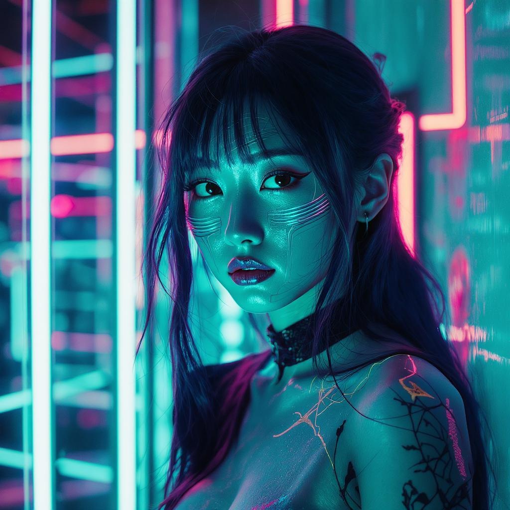 Full length portrait of a woman illuminated by vibrant neon lights, set against a brightly lit background. The image features stylized portraiture with layered lines, inspired by Asian aesthetics and executed with hyper-realistic detail and intense close-ups. The contrasting shadows add depth, while the influence of neon Art Nouveau emerges through hyper-realistic sci-fi elements and the brightness of pop art. Silhouette figures are subtly visible, and the palette is dominated by light cyan and light crimson hues. The work is reminiscent of Paul Corfield's complex layers and textures, captured using a Fujifilm X-T4 and a Sony FE 85mm f/1.4 GM lens, emphasizing a raw, richly detailed style.