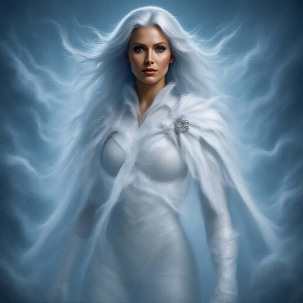 Transform to extreme vivid fantasy realism style art, capturing Storm from Marvel Inc. in a hyper-realistic fantasy digital photography masterpiece. Meticulously detailed and beautifully composed, the image is centered with overexposed elements, creating a striking, ethereal atmosphere. A sharp focus ensures exquisite details, with clear and bright highlights on her iconic white attire. Her expressive eyes convey both power and compassion, while intricate details showcase her dynamic pose and flowing cape. Seamlessly merging realism and fantasy, the image celebrates her essence as a weather controller in a visually stunning and imaginative setting. Small creative modifications introduce swirling storm clouds in the background, enhancing the sense of command and supernatural power.