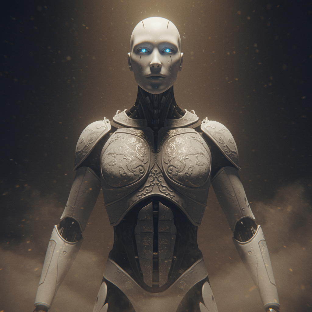 A humanoid android with sleek white porcelain skin and piercing azure eyes stands poised, enveloped by a shroud of ethereal mist that hints at a ghostly presence. Its form is adorned with intricately ornate armor, shimmering as if woven from the finest silver, casting subtle reflections in the low amber glow of cinematic lighting. The detailed textures of the android's armor and form are captured with hyper-realistic clarity, showcasing an extraordinary blend of fine art digital craftsmanship and advanced 8k redshift rendering. This vision, reminiscent of Mark Molnar's mystical artistry, presents a ghost-phantom effect that blurs the boundaries between reality and fantasy, creating a spellbinding tableau that feels almost tangible yet otherworldly.