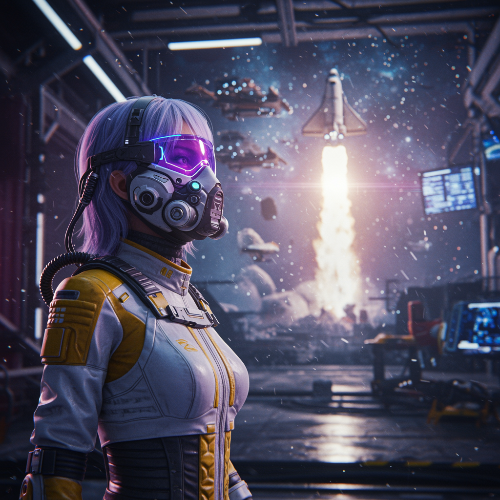 A female figure stands in a meticulously detailed white and yellow jumpsuit at a bustling spaceport, gazing at a ship launching into the starry sky. Her face partially covered by a sleek, sci-fi respirator and purple visor, both designed with intricate technological artistry. The scene captures the essence of a vibrant, hyperrealistic universe, filled with luminous reflections and stunning atmospheric depth. The surreal and celestial environment is alive with color, cinematic lighting, and extreme detailing, evoking the essence of an anime masterpiece. The visual narrative is enhanced by CGI elements from Unreal Engine 5, showcasing smooth, shiny surfaces and intricate lens effects, creating a divine and almost surreal quality. This photographic marvel emphasizes the cosmic and otherworldly, presenting a fusion of futuristic imagination and artistic mastery, leaving a lasting impression of a dystopian yet captivating world.