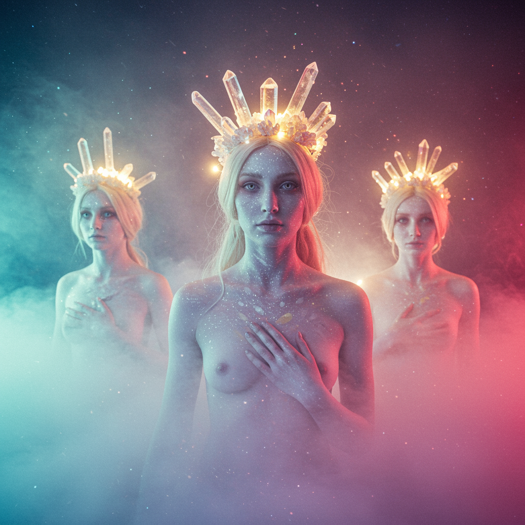 Pastel hues, abstract forms, ethereal portrait of mystical beings enveloped in shimmering lights amidst a dreamy blend of colorful mist, crystals adorning their crowns. Serenity and elusive allure, surrealism, vibrancy and shape, emotional resonance, boundless imagination, exemplary artistry, flawless physique, 32k UHD resolution, superior quality, high-definition, lifelike imagery, advanced photography, cinematic perspective, dramatic lighting, full-body view from afar, cowboy perspective, direct gaze towards viewer, low-res emulation, poor quality, extra fingers, flawed anatomy, incorrect hand depiction, watermark presence, undesired elements removed.