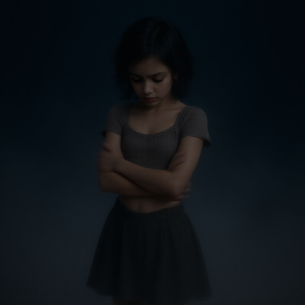 A young girl stands with her arms crossed and a serious expression, looking down at the ground under the nighttime sky. Her figure is slender, revealing defined abs and ribs, and she wears an A-line skirt paired with a small crop top. Her black hair is shiny and styled in a short and messy manner. The scene is captured with ultra-realistic detail, exhibiting elegant and intricate artistry with sharp focus. The depth of field emphasizes the mid shot, with volumetric fog adding atmosphere. The image is in high dynamic range, trending on social media platforms. The aesthetic embodies sophistication and clarity, free from distortions, maintaining accurate anatomy and proportions.