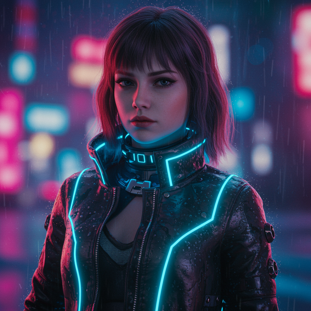 A portrait of a young European girl in a futuristic sci-fi fashion jacket inspired by a rainy movie scene. Her attire blends royal elegance with cyberpunk aesthetics, featuring low-emission neon highlights reminiscent of Bladerunner. The scene is infused with dramatic lighting and set against a neotokyo synth-wave backdrop. Her face is perfectly proportioned with a sharp chin and fine details, capturing an idealized beauty that is both realistic and lifelike. The overall image is highly detailed, rendered in ultra-high resolution with a focus on hyper-realistic textures and rich colors that evoke a cinematic quality. This visual masterpiece combines elements of photography and digital art, introducing subtle creative changes while maintaining a cohesive futuristic style. With an emphasis on realism, the design avoids any distortions or imperfections, presenting an immaculate and seamless portrait.