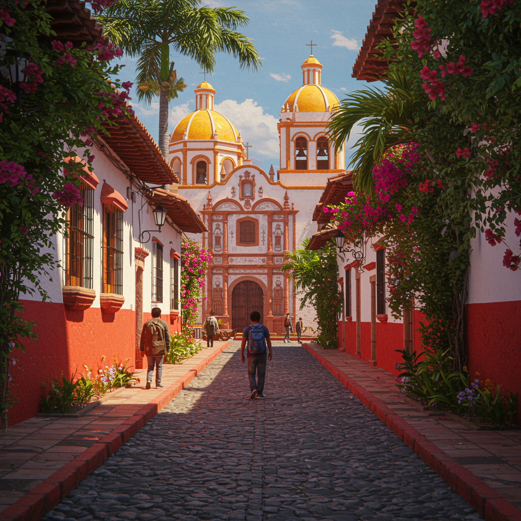 A person leisurely strolls down a cobblestone street lined with vibrant flowers and lush greenery, bordered by a grand church with a striking yellow roof that glistens in the sunlight. The scene is painted in the rich, warm colors of Hispanic culture, with light red and white hues complementing each other. The expressive faces of passersby are marked by distinctive, sculptural noses, reminiscent of post-impressionist portraiture. This setting evokes the enchanting style of Claude Monet, capturing the essence of a dazzling cityscape that feels alive with the movement of exotic flora and fauna. The atmosphere is vibrant, like a visual feast prepared for a #vfxfriday, merging the natural and abstract into a harmonious blend.