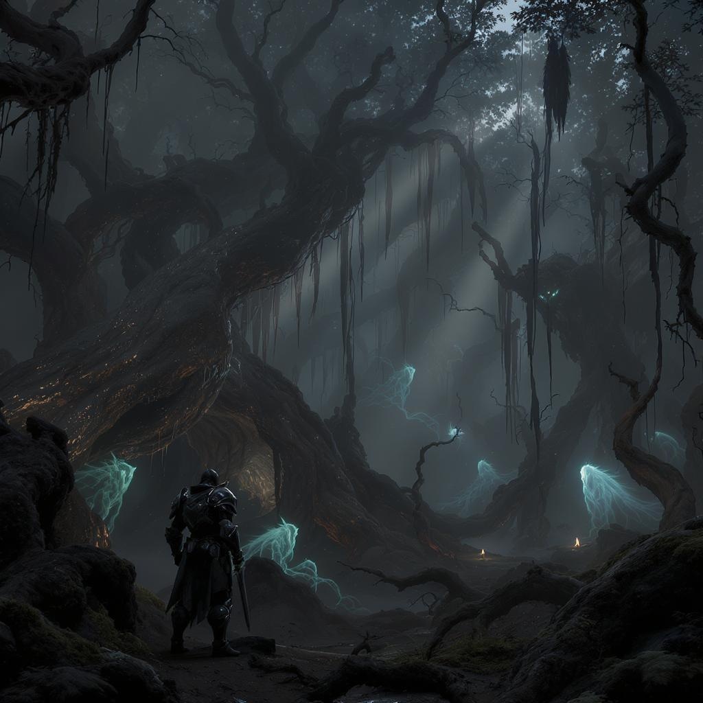 Epic dark fantasy scene with realistic lighting, featuring an ancient, enchanted forest bathed in hauntingly beautiful volumetric lighting; intricate details of twisted trees and mystical creatures fill the landscape. A lone, armored warrior stands in the foreground, illuminated by ethereal light filtering through towering canopies. The atmosphere is both ominous and magical, capturing the essence of a mystical world crafted with the precision of concept art and the immersive quality of a scene rendered in Unreal Engine. This visually stunning composition is worthy of trending on Artstation, boasting the clarity and resolution of Full HD and 8K, inviting viewers to lose themselves in the depth and detail of this dark, captivating realm.