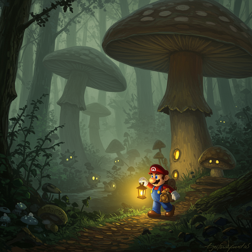 In a daring pursuit of elusive fungi, Mario delves into a mystical forest shrouded in enigmatic fog. Ancient, towering mushrooms dominate the landscape, their gnarled structures suggesting secrets yet to be uncovered. With a lantern in hand, Mario's path is illuminated by a gentle, golden glow that battles back the encroaching shadows. The air is thick with suspense and intrigue, every rustle in the dense underbrush whispering of unseen life. This forest seems alive, its hidden wonders just waiting to be discovered at every turn. The scene is immortalized in oil on canvas, with chiaroscuro techniques deftly highlighting the interplay of light and dark, capturing the essence of a realm brimming with enchantment and mystery.