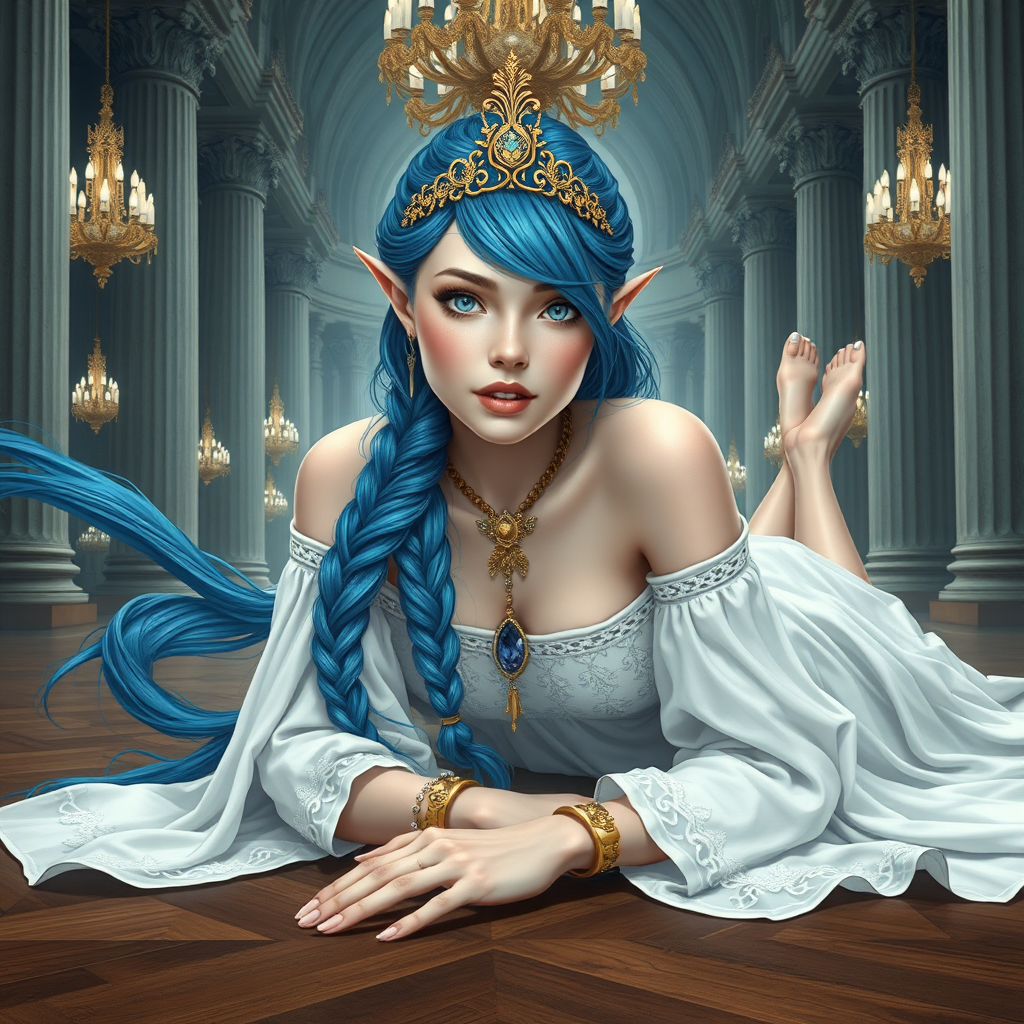 Flowing long blue half-tied braid, detailed striking face and captivating blue eyes, wearing an intricately designed elven tiara, circlet, bracelet, and amulet. Her off-shoulder white dress features delicate patterns and long sleeves, complemented by a white cloak. She has pale, milky white skin, a tiny waist, and thick thighs, and is adorned with high heels. Laying gracefully on the floor of a grand hall with chandeliers and massive columns, she exudes an air of elegance and ethereal beauty. The composition is photorealistic and hyperrealistic, capturing the fine details with a sense of mastery. Her serene expression and masterfully crafted gold leaf circlet add to the enchanting ambiance. This artistic illustration embodies elements of 3D and hand-drawn sketches, capturing a sense of fantasy and surreal charm.