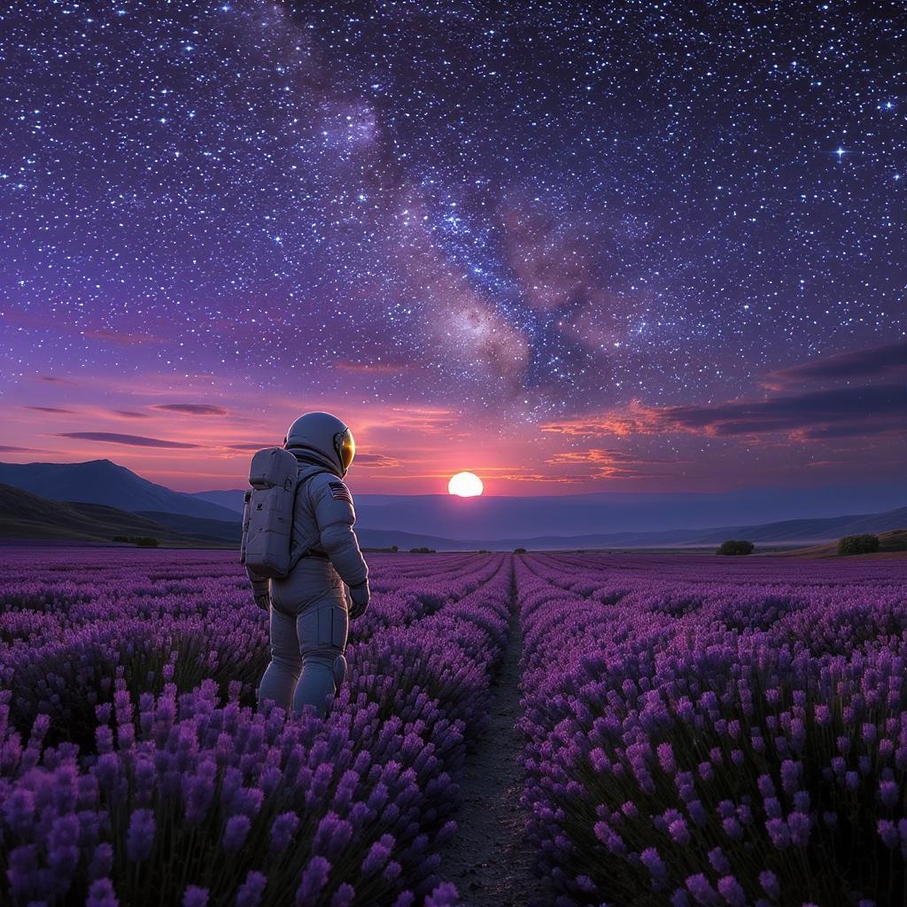 An awe-inspiring photograph capturing an astronaut standing in a surreal lavender field under a mesmerizing twilight sky; the scene is a sci-fi masterpiece of atmospheric photography. The landscape is highly detailed and hyperrealistic, with distant mountains casting gentle shadows. The sky is painted in hues of deep purple and soft orange, dotted with twinkling stars. The astronaut, in a sleek, polished spacesuit, gazes at a bright celestial body on the horizon. The image is rendered in stunning 4k resolution, emphasizing every blade of lavender and the intricate patterns on the astronaut's suit, embellished with enhancements from the nartfixer suite for breathtaking visual clarity.