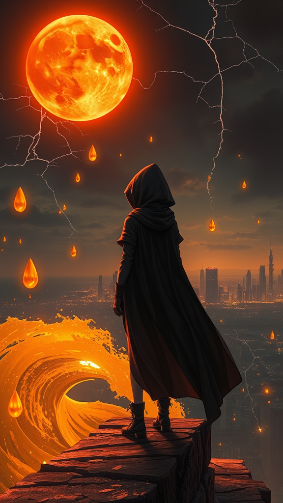 Masterpiece, best quality, a golden sea wave illuminated by a bright orange sunset, golden droplets suspended in air, 1girl standing on a ledge with a panoramic view of a city at night, stylized urban fantasy art, cloaked Sith Lord appearance, digital cyberpunk anime style, a looming blood moon, adorned with a futuristic hooded cape, cyberpunk science fiction theme, intense dark illustration, anime girl emanating a cyberpunk aura, under a crimson moon, rendered with Unreal Engine, sky peeling away revealing broken winds, cracks unveiling the sky, hyper-detailed realistic materials, dramatic interplay of light and shadow, Unreal Engine 5 concept art, cracked sky, evocative of Unreal Engine art, capturing an atmosphere of tension and wonder.