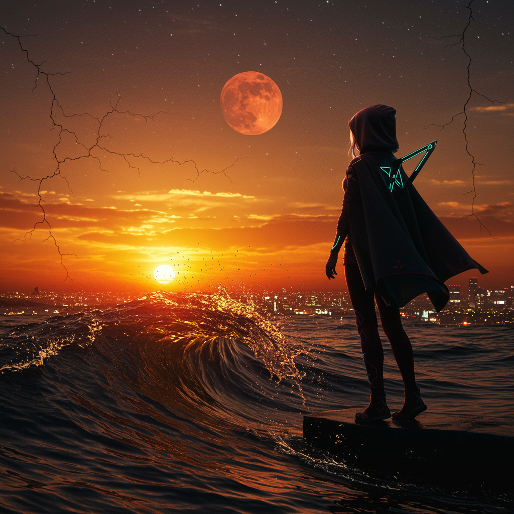 Masterpiece, best quality, a golden sea wave, bright orange sunset filtering through the wave, golden water droplets in motion, 1girl, standing on a ledge with a panoramic view of a city at night, stylized urban fantasy, hooded enigmatic figure with a sci-fi twist, digital cyberpunk anime art, blood moon illuminating the scene, wearing a futuristic hooded cape, an integration of modern science fiction and dark cyberpunk aesthetics, anime-inspired cyberpunk girl with a hood during a blood moon, rendered in Unreal Engine 5, fractured sky, winds flowing through celestial cracks, hyper-realistic material textures, extreme detailing, dramatic lighting effects, breaking sky, Unreal Engine concept art.