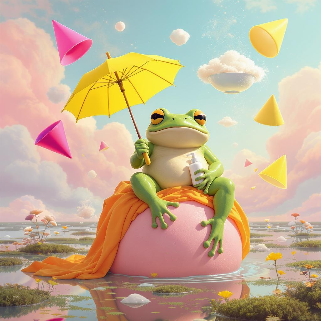A whimsical scene unfolds with a large, green, anthropomorphic frog exuding a serene aura. It is perched upon a soft, pink sphere draped in a flowing orange cloth. In one hand, the frog delicately grips a vivid yellow umbrella, while in the other, it cradles a petite spray bottle. The air around it teems with floating, abstract shapes, including vibrant pink and lemon-yellow cone forms, alongside a bowl brimming with ethereal, cloud-like fluff. The backdrop is a soft, pastel sky painted in hues of rosy pink and baby blue clouds. Below, the ground mimics an enchanted swamp with a lush, mossy texture, adorned with floating vegetation and dainty, sprouting plants. The scene radiates a gently surreal atmosphere, filled with soft illumination and a playful sense of fantasy.