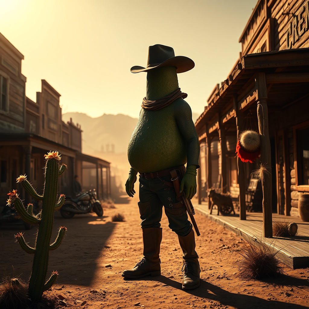 A cinematic scene captures a lone desperado transformed into a surreal avocado figure, set against the backdrop of a dusty, sun-drenched wild west town. The avocado desperado stands confidently, its textured skin reminiscent of rugged leather, casting long shadows under the merciless sun. Incredibly detailed, the scene reveals the surrounding weathered wooden storefronts and distant mountains blurred by heat haze, all rendered in astonishing 8k hyper-realism. Small creative touches include a cactus with blooming flowers and a tumbleweed caught mid-motion. The atmosphere is tense, filled with anticipation, while a gentle breeze lifts specks of dust into the air, painting a vivid portrait of an otherworldly yet familiar western tableau.