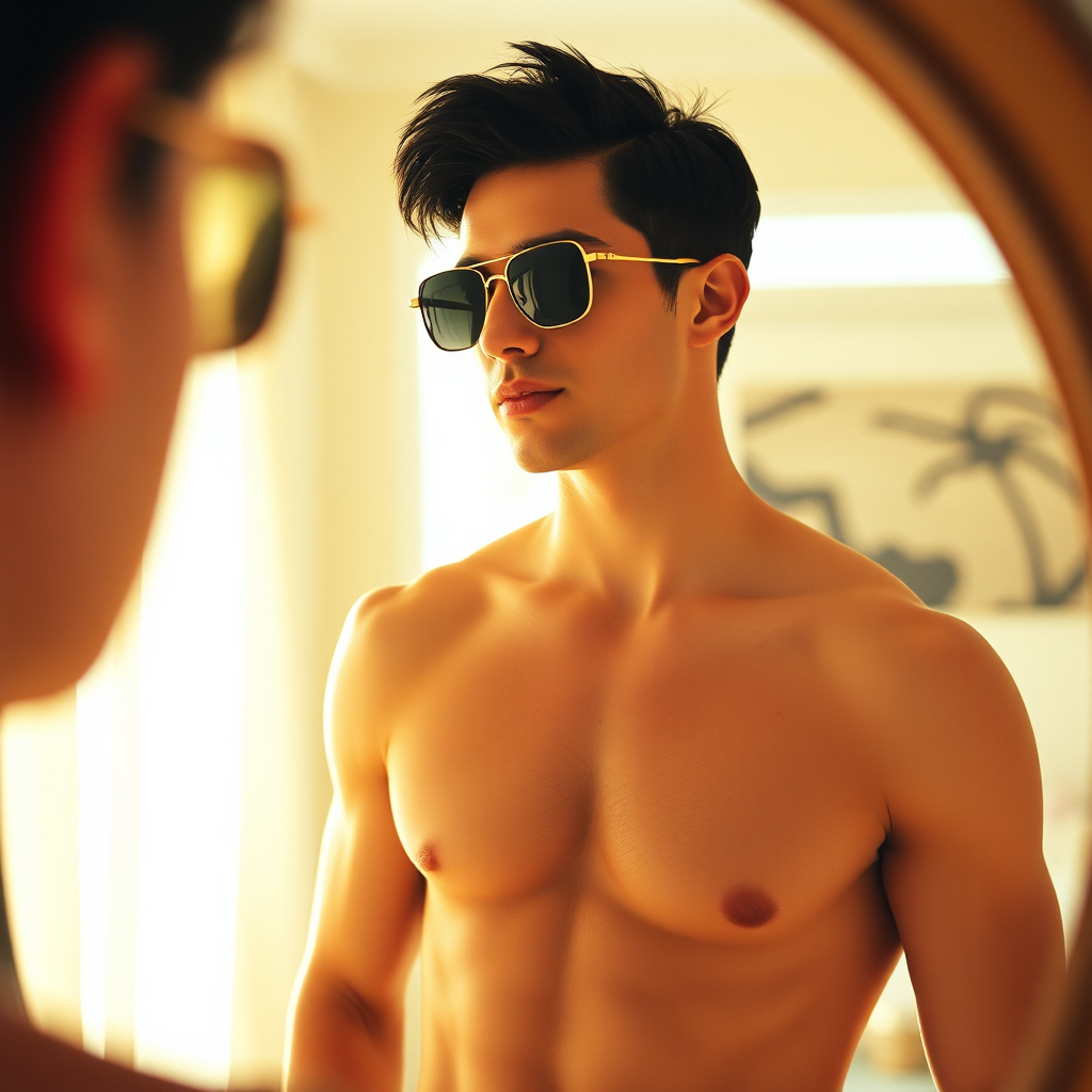 Hyper-realistic photo of an attractive man in stylish beachwear and sunglasses, captured in a mirror with an iPhone 14. He has short dark hair and is standing in a sunlit, cozy, bright room. The image has a film grain effect reminiscent of Kodak Portra 800, with a shallow depth of field at f1.8, all illuminated by the warm glow of the golden hour.