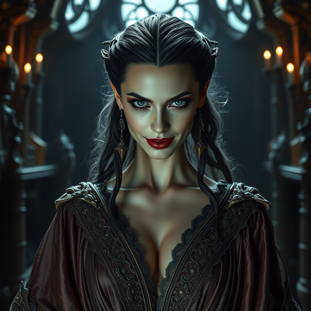 Ancient Strigoi vampire queen with an aura of dark majesty, her piercing eyes reveal centuries of secrets, clad in intricate, flowing robes that shimmer in the moonlight, her skin pale and flawless like polished marble, sharp fangs slightly visible behind her sly, knowing smile. She stands in a shadowy, Gothic chamber filled with relics of forgotten civilizations, her presence both terrifying and mesmerizing, every detail of her visage captured in ultra-detailed, cinematic clarity with high dynamic range, the atmosphere tense and eerie, evoking fear and fascination.
