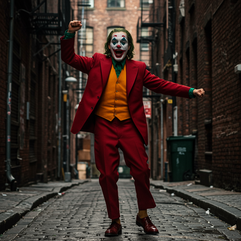 A dynamic, full shot of a Joker-like character, a Caucasian man in his late 20s or early 30s, wearing exaggerated clown makeup. His vibrant and striking red costume is composed of a bold, red three-piece suit with a bright green vest, presenting a daring style choice that defines his character. The suit has a sharp, tailored cut and appears to be made of a smooth, slight glossy fabric, paired with dark reddish-brown leather dress shoes. His arms extend outward with one fist triumphantly raised, embodying a sense of jubilant defiance. His posture is dynamic and expressive, radiating his complex persona. His expression is one of manic triumph and joy. He stands in a narrow urban alleyway, captured from a low-angle, wide shot perspective, surrounded by towering brick buildings that form a gritty urban New York-style environment. The worn structures display detailed brick and metal elements. The alleyway floor is laid with large, dark, gray-brown paving stones. Dramatic lighting casts natural shadows with low contrast, accentuating the subject's intensity. The overall atmosphere is theatrically dramatic, exhibiting a heightened reality matching the film's style. Detailed makeup, intense expression, and stylish attire are captured with flair and precision, embodying a cinematic movie poster aesthetic.