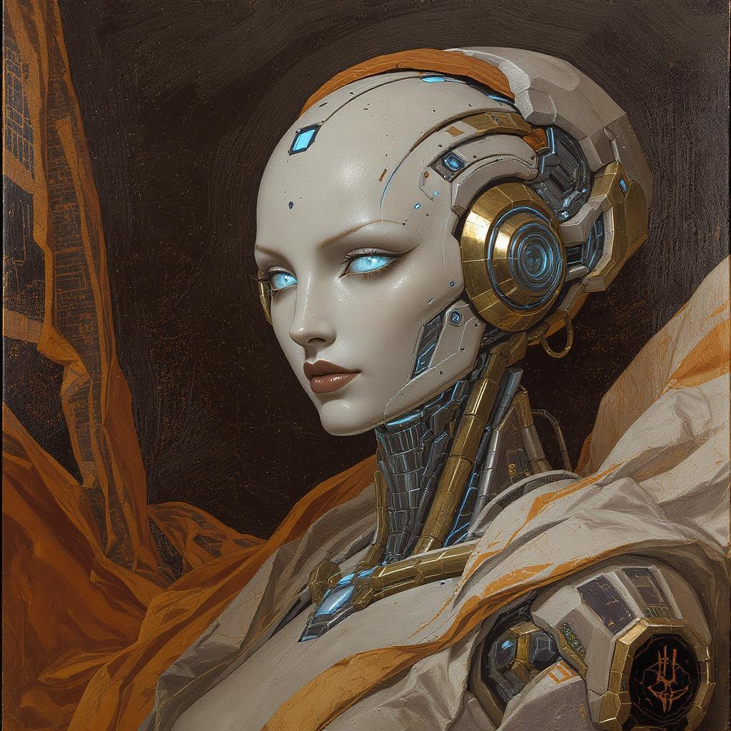 Sci-fi fantasy illustration featuring a stunning robot, in the style of hyper-detailed realistic portraits, using a palette of dark white, orange, and dark gold with aquamarine accents. The artwork blends classicist portraiture with modern technological wonders, showcasing intricate realist details and sharp edges that highlight the robot's features as a technological marvel. The portrait embodies a sense of timeless elegance and sophistication, capturing the essence of both the future and classic artistry.