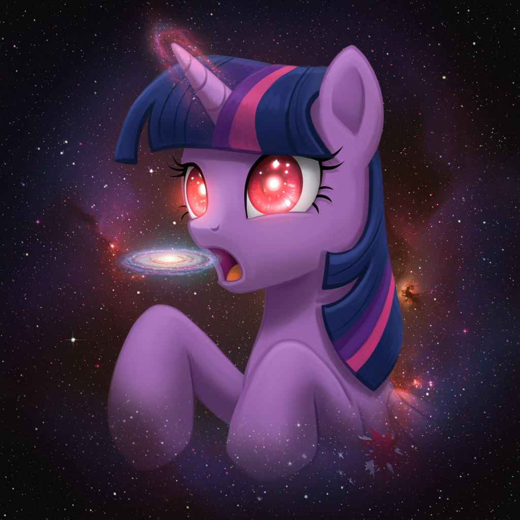 Enormous Twilight Sparkle from My Little Pony, larger than a galaxy, floating gracefully in the cosmic expanse, a tiny galaxy hovering near her illuminated, mesmerizing eyes, which glow a deep, fiery crimson. An extreme close-up captures the intricate details of her majestic open mouth as she prepares to swallow the galaxy whole; her iridescent mane flows ethereally around her, mingling with stardust and nebulae, photo-realistic hyperbole.