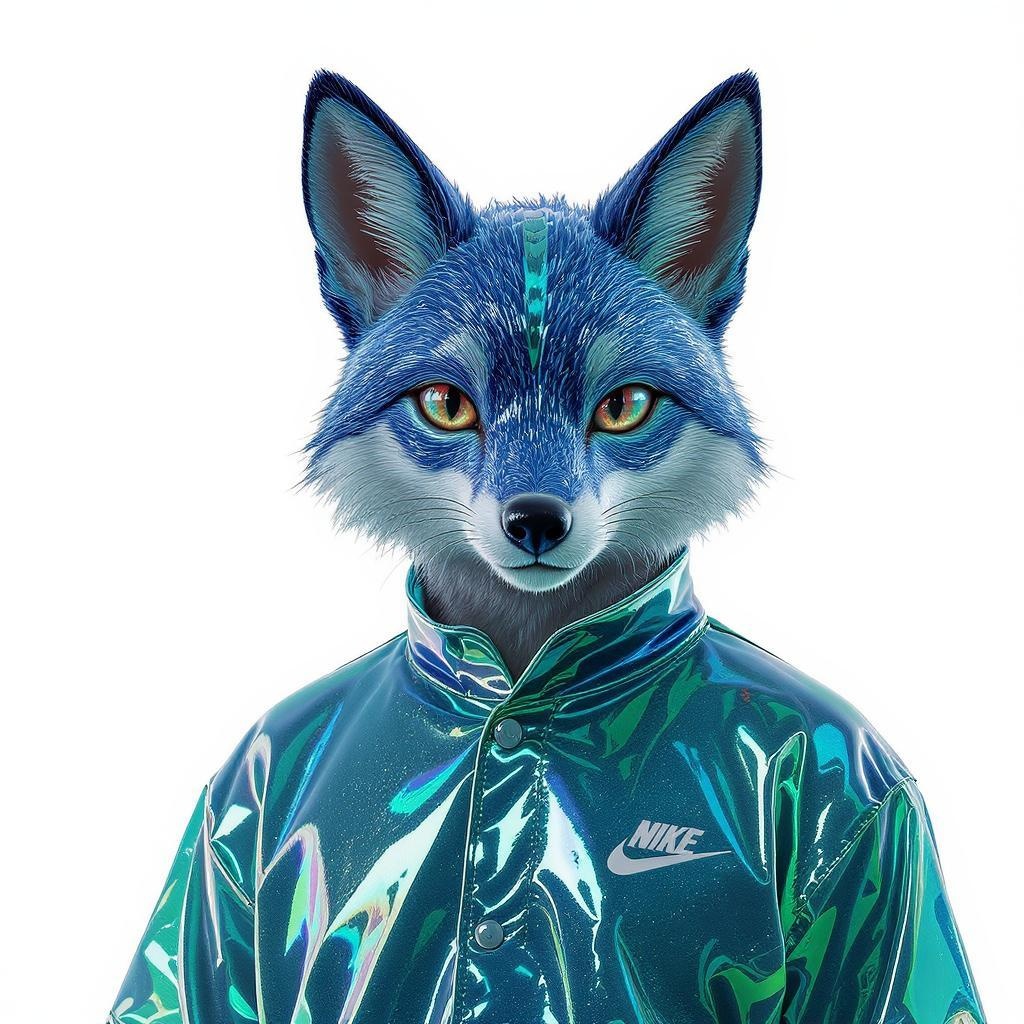 A 3D cartoon fox head with a human body, adorned in an iridescent holographic liquid texture, wearing a translucent sun-protective shirt that exudes a boss feel. The shirt, inspired by Nike and Adidas design aesthetics, is imbued with WitchPunk and Y2K style elements, featuring shades of green and blue and a metallic feel with strong reflection. The scene is set against a plain, pure single color background, evoking a digital fashion and surreal futurism vibe. Styled in the manner of Supreme Kong NFT artwork and Disney aesthetics, the piece captures a headshot photography mood typical of a portrait studio shoot and fashion editorial aesthetics. Rendered in high resolution with inspirations from HAPE PRIME NFT and Bored Ape Yacht Club NFT projects, the design showcases high detail, fine luster, and an ultra-detailed 8K resolution with bright front lighting, emphasizing a face shot with exceptional clarity and vividness.