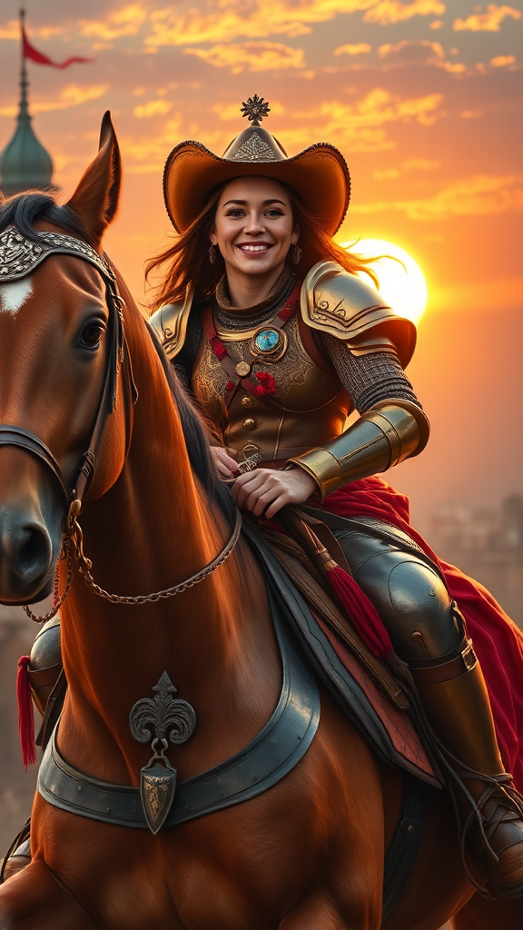 A joyful and charming female cowgirl knight, adorned in a unique blend of traditional Western and medieval armor, rides atop a majestic horse. Her face beams with a bright smile, exuding confidence and grace as they charge into the gentle glow of an enchanting sunset. The scene is reminiscent of a Venetian carnival, rich in vibrant colors and intricate details. The composition captures the energy of a dynamic battle, all rendered in stunning high resolution and hyper-realism, akin to an oil painting reminiscent of the style of Frank Frazetta, with vivid brushstrokes bringing the epic fantasia to life.