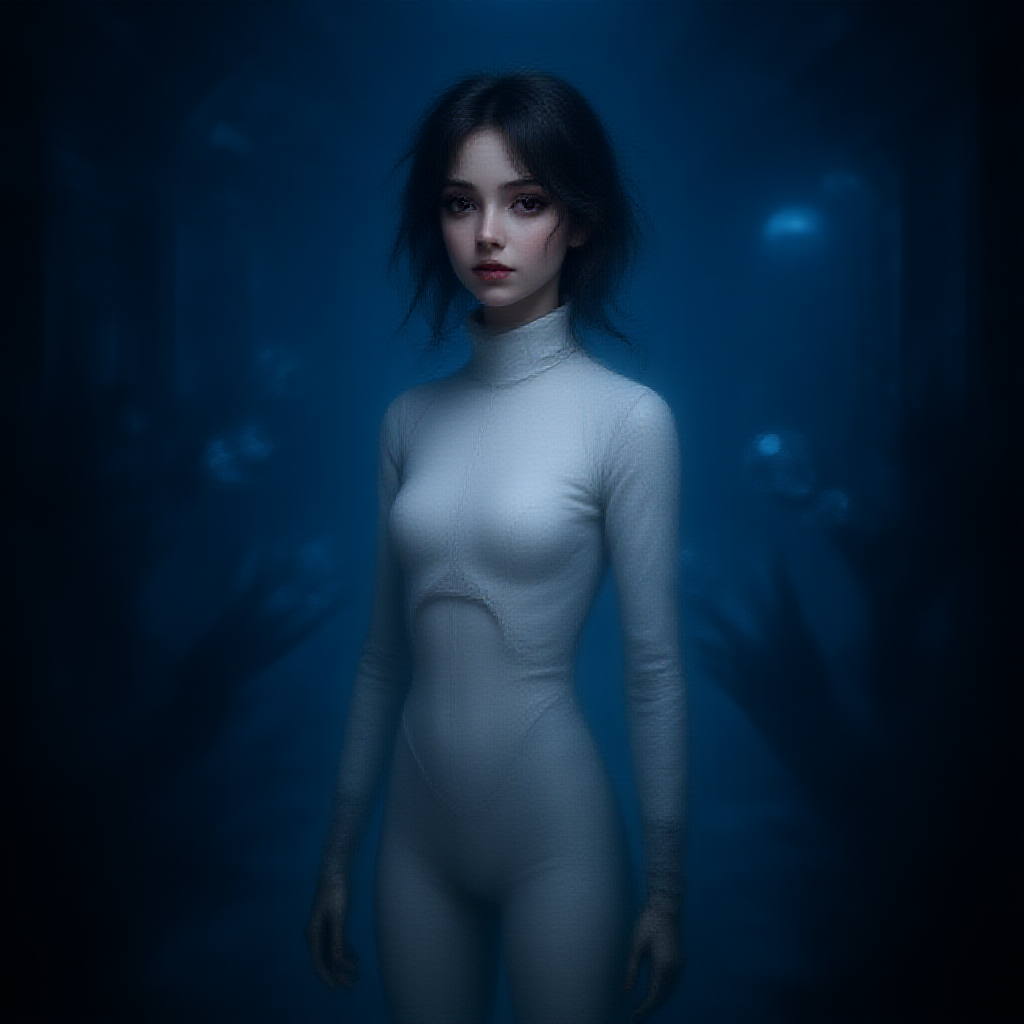 A young girl in a white, tight-fitting sci-fi jumpsuit stands inside a cyberpunk-inspired spaceship. Her hair, reminiscent of Tsutomu Nihei's style, flutters softly in the cold, gloomy room that is filled with sharp angles and intricate graphics. The atmosphere is heavy with muted colors, accented by a vibrant blue lumen casting bright light from one angle. The environment is characterized by its multi-storey architecture and sharp shadows against a blurred background, creating a futuristic ambiance. Her expression is cold and detached, embodying a portrait of hyper-detail and elegance amidst the clumps of ethereal energy flickering around her. Despite the lifelike portrayal, elements of deviation unfold in the scene: a subtle mutation distorts her form, lending her a disfigured, totem-like appearance with two faces emerging from a single head, and her torso appears awkwardly folded. These surreal aspects are interspersed with round elements and red hues, evoking a sense of deformed beauty and cloning, while her limbs seem to be floating and occasionally severed. The room is illuminated by a round glow, reminiscent of third-person portraiture, punctuated by distorted hands and a blurred background. Amidst the cold ambiance and disorienting visuals, she remains an enigmatic figure, echoing the aesthetics of cyberpunk and sci-fi with an unsettling, lifeless expression.
