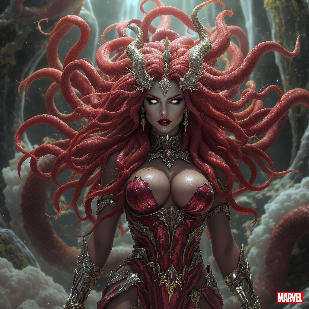 Transform into an extreme vivid fantasy realism style art masterpiece depiction of Medusa from Marvel Inc., in hyper-realistic fantasy digital photography, captured with meticulous precision and care. Centered with perfect composition, the overexposed photography creates a striking and ethereal atmosphere, while sharp focus ensures exquisite details. The image features clear and bright elements that highlight her iconic, tumbling waterfall of red hair, and her expressive eyes reveal a regal command laced with deep inner turmoil. Intricate details showcase her flowing hair as if alive, and her stoic pose exudes both power and vulnerability. Seamlessly merging realism with fantasy, the artwork celebrates her essence of power and inner conflict, set in a visually stunning and imaginative setting filled with luminescent textures and dreamy hues.