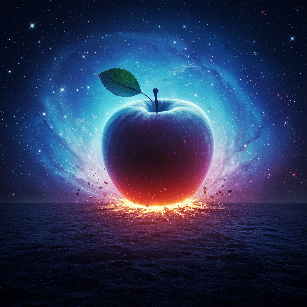 A colossal apple descends and impacts the ground amidst swirling galaxies, enveloped in vibrant and surreal hues, with a focus on rich blues and purples. The scene exudes a cosmic, otherworldly atmosphere, embodying an abstract and dreamlike style, transcending reality with an ethereal allure.