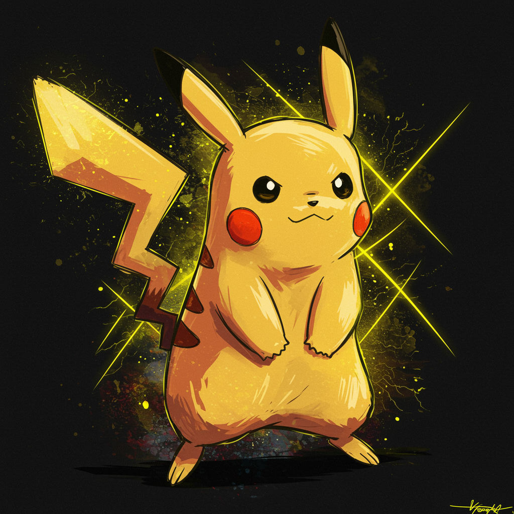 Pikachu in an energetic stance with an anime flair, sketched in nvinkpunk style; incorporating abstract brush strokes and bold, heavy lines; infused with HDR Neo-Noir elements, highlighted by vibrant yellow neon accents interwoven with minimalist touches for a dynamic and modern visual representation.