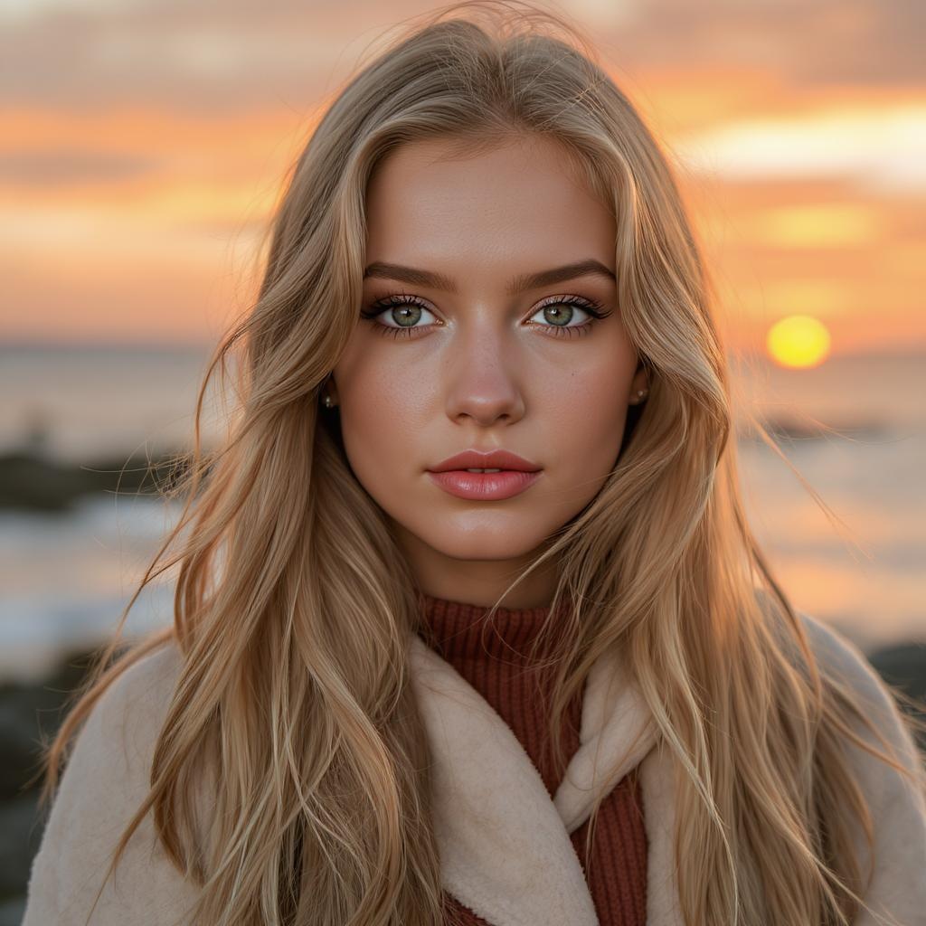 Photo realistic portrait of a stunning Scandinavian girl with medium blonde hair, captured at sunset. Her face is detailed, intricate, and sharply focused with a symmetrical structure. Shot with a depth of field using an f/1.8, 85mm lens on a Nikon Z9, exuding a serene and captivating beauty. Avoid any elements of bad anatomy, blurriness, or deformations, ensuring a flawless and harmonious composition.