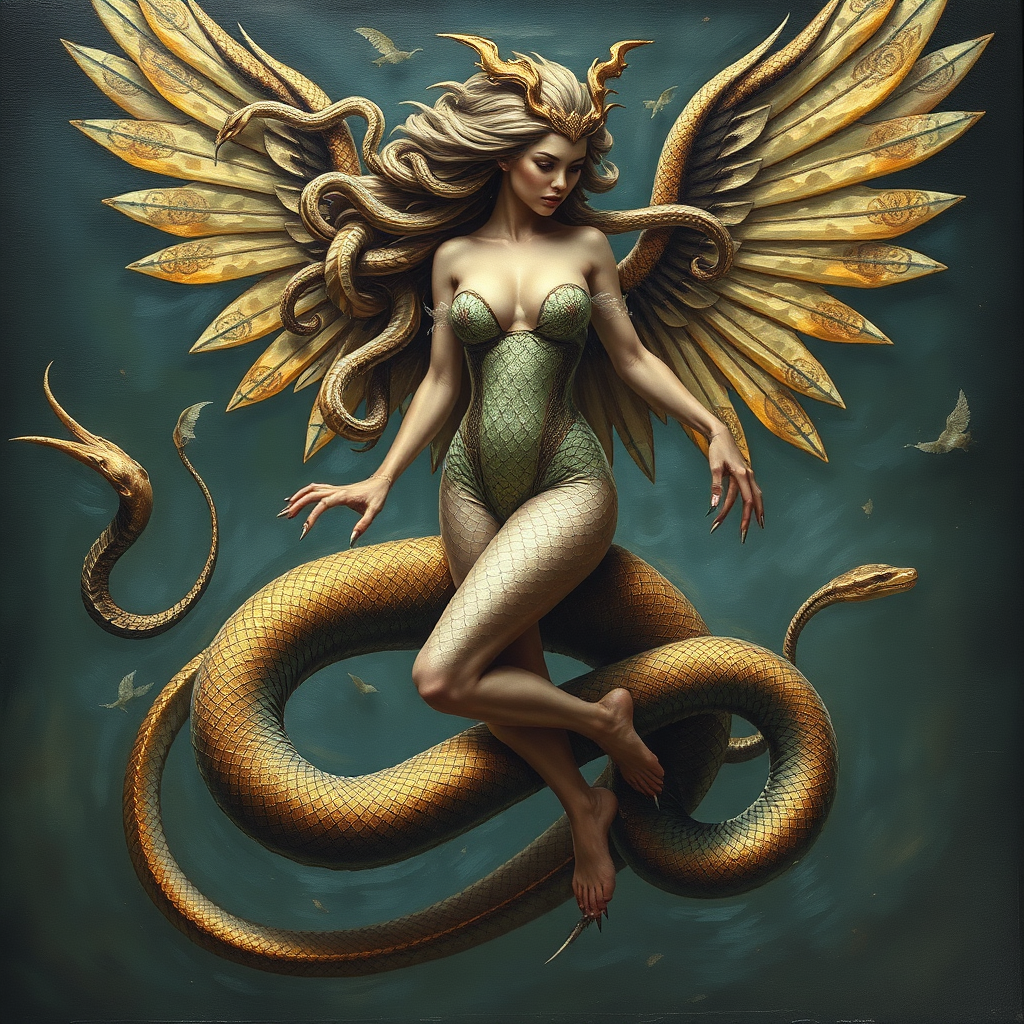 Ethereal, captivating Gorgon glides gracefully on her serpentine tail, her hair a mesmerizing cascade of entwined, animated snakes. Her exquisite hourglass figure is enveloped in lustrous, iridescent scales, and her copper-toned hands are adorned with razor-sharp, steel-like claws. Majestic wings embellished with dazzling golden plumage unfurl behind her. Rendered in a realistic style with masterful brushstrokes, the piece is expressive, textured, and hyper-detailed, capturing nature's essence with precision. The dark fantasy aesthetic is enriched by a deep, rich palette, reminiscent of oil paintings on high-quality canvas. This limited edition piece, echoing the golden ratio, is an award-winning portrayal that immerses the viewer into a 4D experience of striking beauty, crafted by Will Murai.
