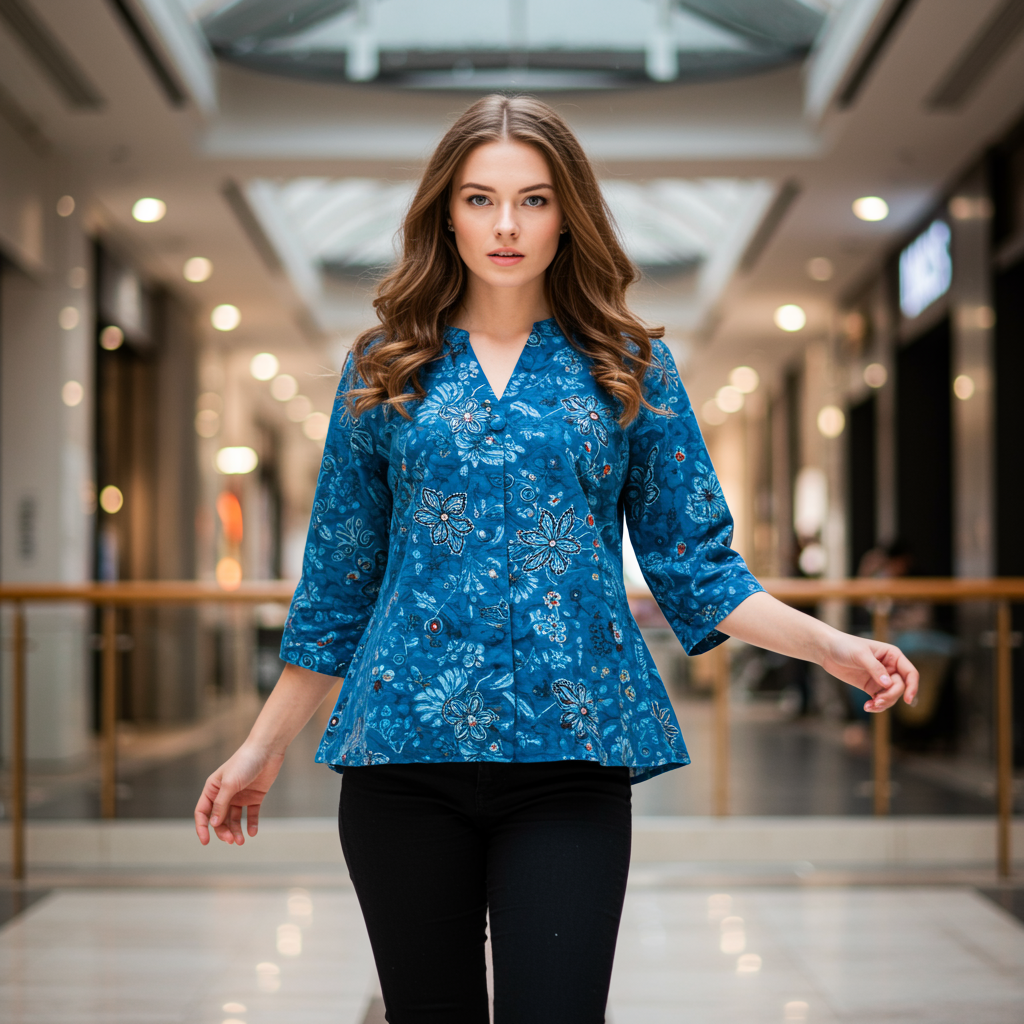 Portrait of an elegant model with captivating blue eyes, gracefully moving in rhythm, wearing a stylish blue batik casual blouse paired with sleek black jeans, embodying fashion in an editorial style, exuding exquisite detail and mastery in composition, the setting enriched by the vibrant ambiance of an indoor shopping mall, with dynamic lighting accentuating her form and creating a compelling play of high contrast.