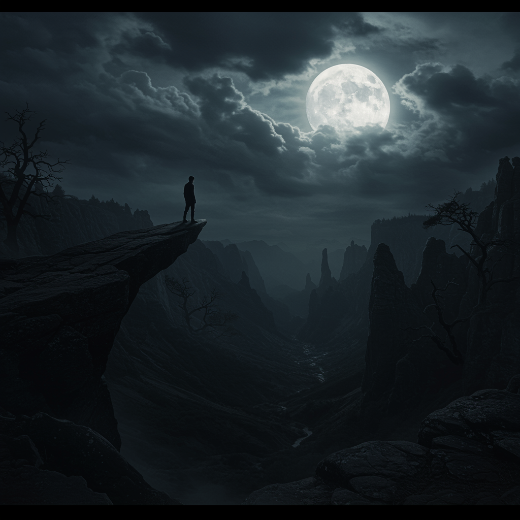 A mysterious and cinematic landscape unfolds with a lone figure poised on the precipice of a rugged cliff, gazing into a forbidding, shadow-blanketed canyon. The figure, silhouetted, seems to merge with the dramatic tapestry of turbulent clouds and a luminous full moon that suffuses the scene with an ethereal, ghostly light. Below, the valley sprawls in deep shadow, where the faint outlines of gnarled, ancient trees contort beside jagged stone formations and yawning chasms, hinting at secrets hidden within the darkness. The composition captures a palpable atmosphere of mystery and suspense, cloaked in dark, moody tones reminiscent of a timeless tale whispered by the wind.