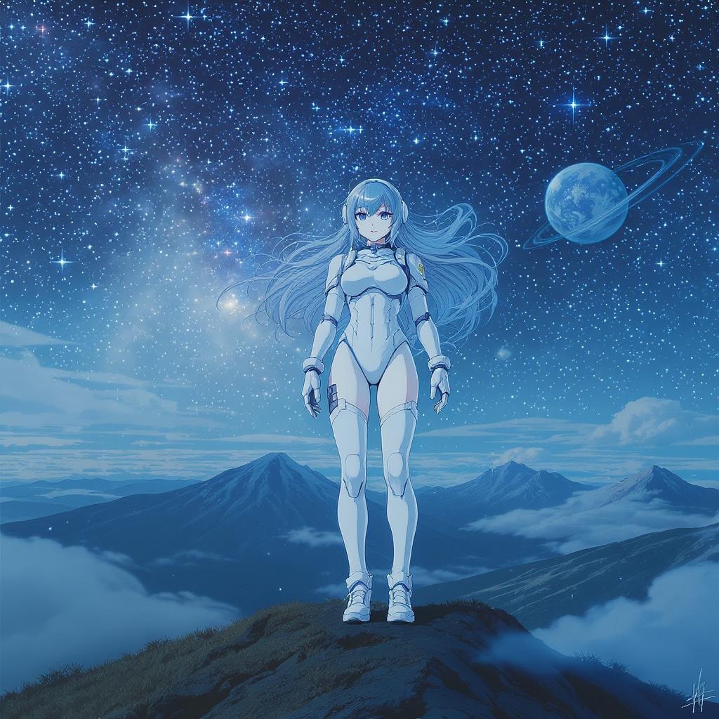 A space girl stands alone on a hill, her presence commanding the scene with a centered, detailed, and beautiful face. Rendered in anime style, the image serves as a key visual with intricate and breathtaking details. The vibrant, panoramic, and cinematic atmosphere evokes the artistry of Carne Griffiths and Conrad Roset, mixed with the magical essence of Studio Ghibli. The scene is devoid of any distortions or artifacts, capturing a seamless, mesmerizing, and clear portrayal of this enchanting subject.