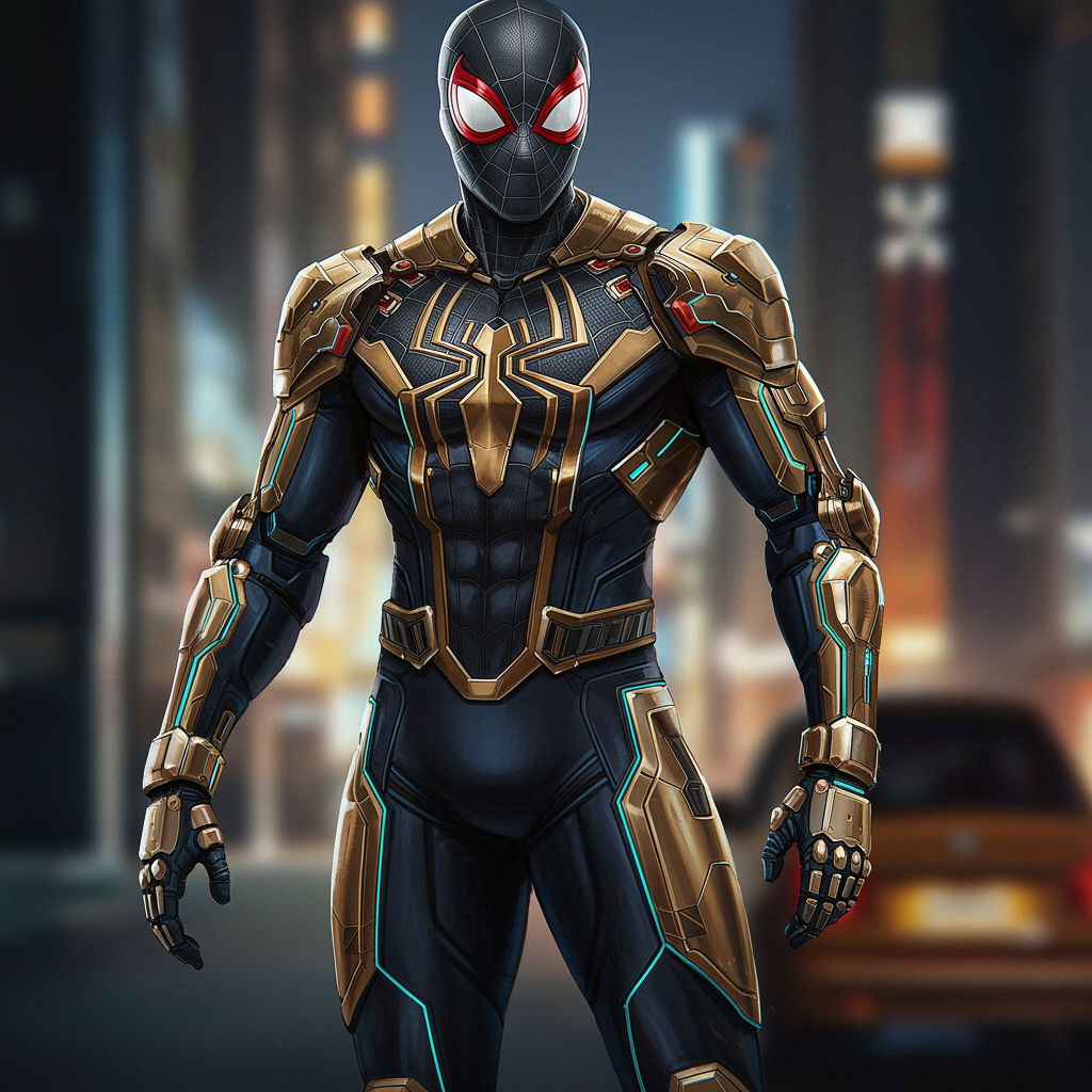 portrait of a futuristic spiderman adorned with cybernetic heavy armor, set in a sci-fi world, featuring glowing intricate designs, full body, elegant and highly detailed digital painting, reminiscent of artstation concept art. The illustration embraces smooth textures and sharp focus, inspired by the styles of artgerm, greg rutkowski, and alphonse mucha, avoiding low resolution, text overlays, or errors, maintaining high quality without jpeg artifacts or unsightly duplicates. The character boasts anatomically correct proportions and limbs, with no signs of disfigurement or mutation, encapsulating a vision of sleek yet robust strength in its design, free from any watermarks or signatures.