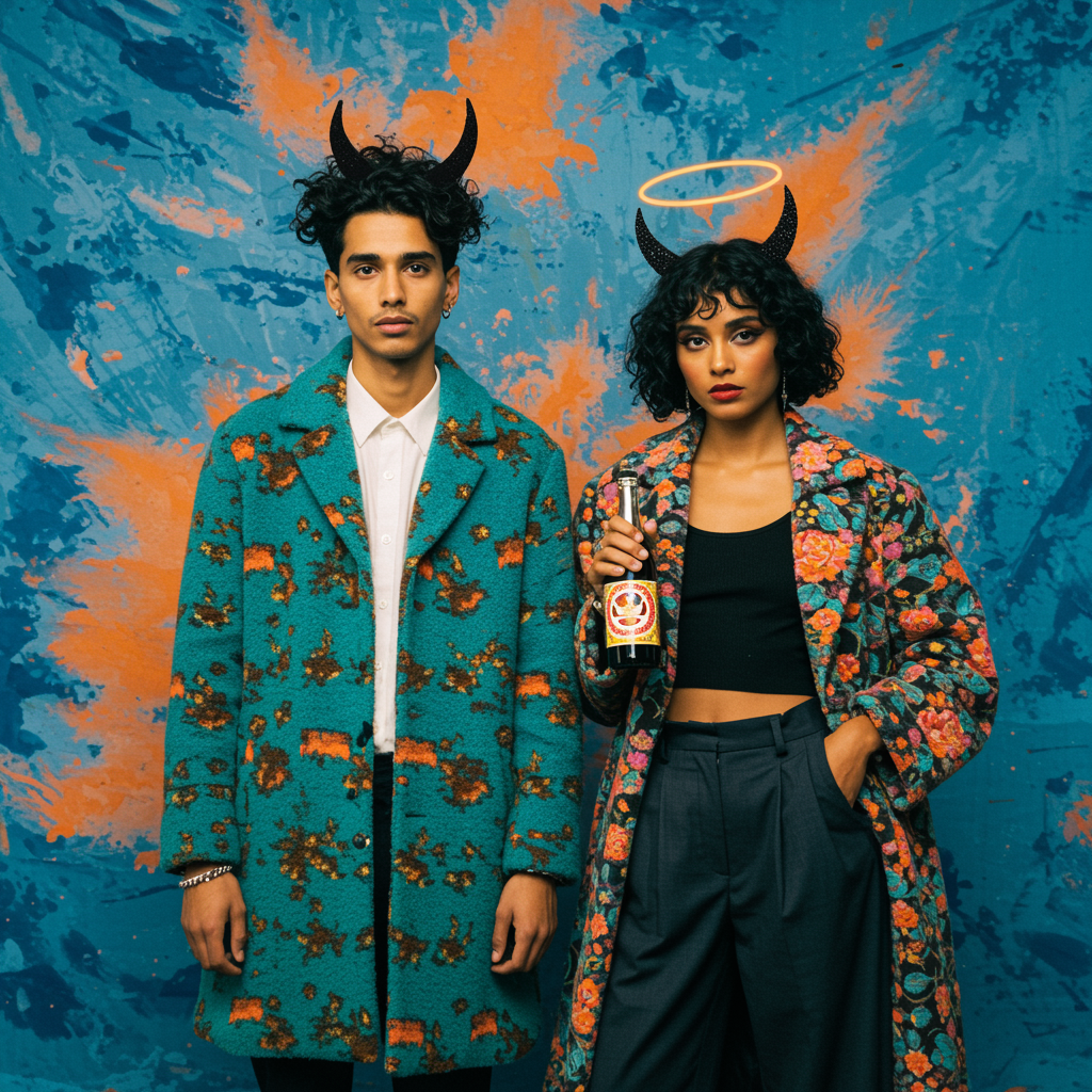 A vivid photograph capturing a real man and woman standing side-by-side, set against a vibrant backdrop where an abstract blend of blue and orange splashes converges. The wall art forms a shape resembling devil's horns subtly positioned behind the woman's head, creating the playful illusion that she has horns, while a shape suggesting a halo sits behind the man's head. The woman, with short, wavy black hair, is dressed in a chic ensemble featuring a sleek black top, stylish high-waisted dark pants, and an eye-catching long, floral-patterned coat. In her hand, she holds a bottle adorned with a striking, colorful label. The man, sporting tousled dark hair, wears a unique teal and orange patterned coat over a crisp white shirt and dark pants, resonating with the vivid backdrop. Both individuals have warm, medium skin tones and are embellished with an array of accessories, including bracelets and earrings, adding layers to their expressive personas. The image pulses with dynamism and expression, emphasizing bold colors and intricate details, encapsulating a moment brimming with artistic flair and subtle nuances.