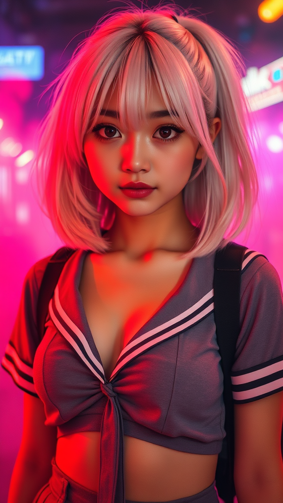 A stunning young Asian girl with medium-length, silky white hair frames her captivating, beautifully bright eyes and perfectly sculpted face. Her olive-toned skin complements her petite, toned body. She wears a schoolgirl uniform that daringly showcases her midriff, highlighting her small breasts. The scene is enveloped in an otherworldly atmosphere with neon light smoke and volumetric fog, casting a magical, cinematic glow. The hyperrealistic setting is rendered in breathtaking 8k UHD, capturing intricate details and surreal beauty. Her hair is styled into a playful ponytail, adding a dynamic essence to the composition. In the background, dreamlike elements mix with hints of artistic abstraction, playing with the concept of reality with subtly distorted features and whimsical imperfections, hinting at a fusion of fantasy and hyperrealism.