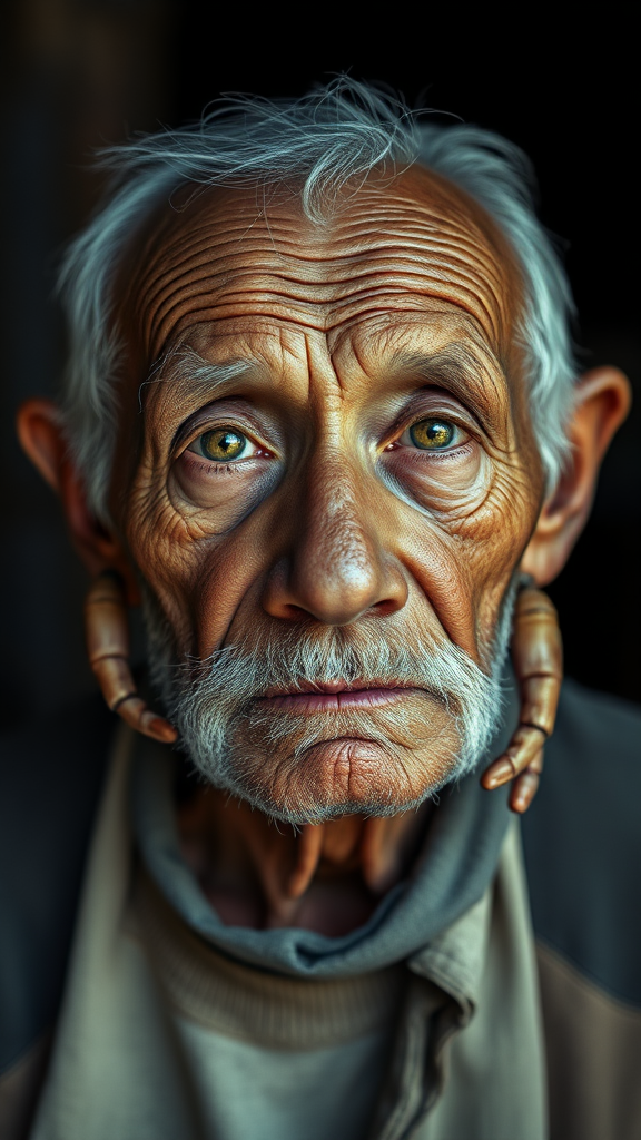 Elderly fisherman, 50 years old, portrayed in a medium-shot professional portrait, using a Nikon Z9 at 100mm with an aperture of f/1.8. He has robot-like eyes and exhibits unusual anatomical features such as extra limbs and digits, leading to a unique, slightly disfigured appearance. The image is characterized by a dreamlike quality, with elements that seem out of focus, fuzzy, and somewhat deformed. Muted colors give the portrait a desaturated, surreal look, while the overall composition includes elements that are blurred and distorted, lending an abstract, unconventional art style.