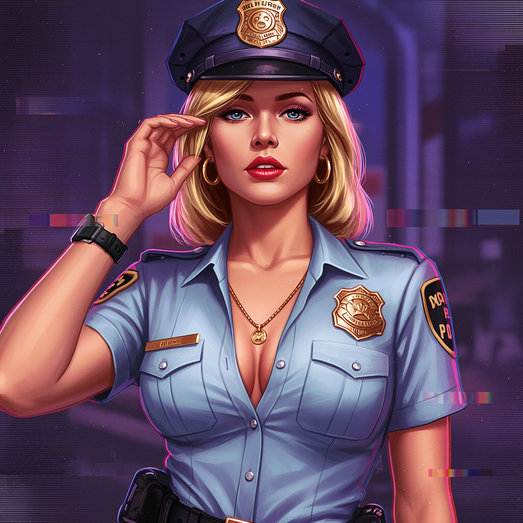 A striking portrait of a 1980s Miami policewoman; she exudes breathtaking beauty and confidence. The composition is centered and showcases intricate, highly detailed features with vibrant colors akin to a comprehensive cinematic style. Elements inspired by artists Guy Denning and Sandra Chevrier are subtly woven in, hinting at the bold aesthetic of Vice City. The portrayal maintains precise lineart and 8k clarity with HDR depth, while also incorporating intentional artistic quirks. These quirks manifest as minor errors and unusual elements such as missing or extra digits, slightly distorted anatomy, and unexpectedly cropped sections, adding a unique character to the piece. The artwork embraces a vintage digital feel, with jpeg artifacts, mimicking the low-res charm of the era. Intentional off-kilter details like blurred or fuzzy areas, tiling, and slight disfigurements lend an oddly appealing mutated and misshaped effect. Watermarks and signature texts are subtly embedded, nodding to the artist's playful commentary on the art world.
