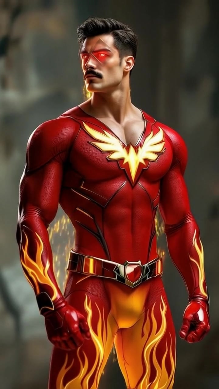 Dramatic superhero portrait, photorealistic male fashion model, dynamic action pose in mid-flight, cinematic lighting, volumetric fire effects. Athletic French Caucasian man, 6'2", lithe muscular physique like a gymnast. Chiseled facial features, high cheekbones, strong angular jawline, pronounced brow. Striking pale ice-blue eyes beneath ruby-red solar shield visor with metallic finish. Styled noir-black hair, undercut fade sides, longer textured top swept back dramatically. Precise black chevron mustache, clean-shaven face, flawless complexion. Wearing form-fitting spandex costume: crimson red compression shirt with deep v-neck to navel, strategic side cutouts revealing obliques, sleeveless to showcase defined arms. Metallic gold geometric hawk emblem emblazoned across pectorals, high-detail rendering. Armored red gauntlets with raised gold flame patterns, energy emanating from palms. Metallic crimson utility belt with angular v-design, tech details. Marigold gold compression tights with arterial flame patterns ascending from knees, high-gloss finish. Crimson metallic boots to knees, gold flame accents, armored appearance. Massive fiery hawk-shaped aura surrounds figure, particle effects, heat distortion. Dual flame streams spiraling from hands, volumetric lighting. Hero shot composition, low angle view, dramatic backlighting, lens flares, smoke effects. Style: hyper-detailed digital art, 8k resolution, octane render, dynamic motion blur, rim lighting, atmospheric perspective.