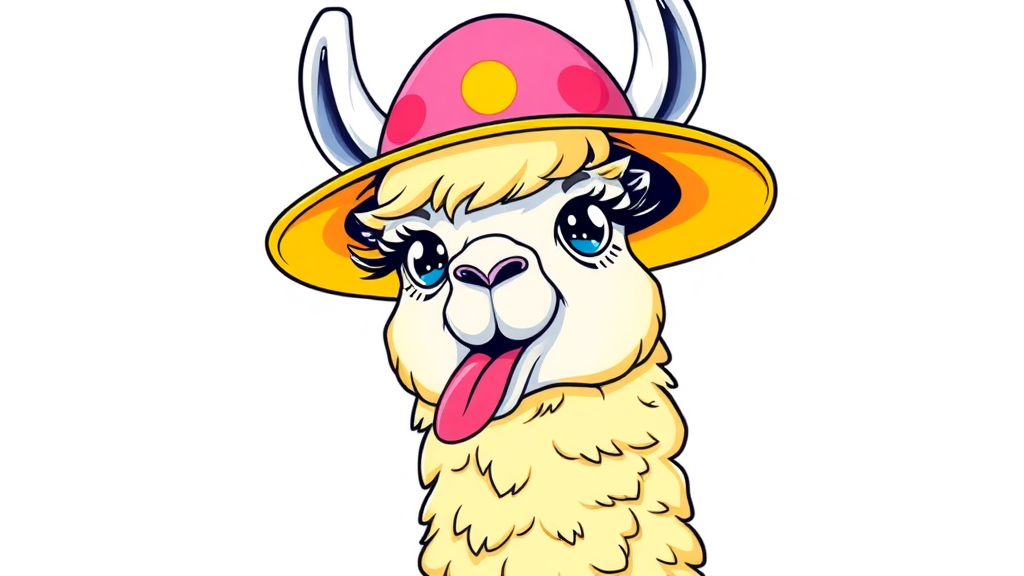 Imagine a whimsical llama bursting with personality, its eyes twinkling with mischief as it playfully sticks out its tongue. The llama sports a quirky, oversized hat adorned with bright polka dots, adding to its charmingly silly appearance. The design employs a spectrum of vibrant colors—electric blues, sunny yellows, and lively pinks—balanced with dynamic, flowing lines that highlight its fluffy coat and joyful energy. The llama’s pose is animated and lively, a picture of contagious cheerfulness, perfect for a sticker design. Contoured in bold outlines against a crisp white background, this adorable artwork radiates fun and heartwarming playfulness.