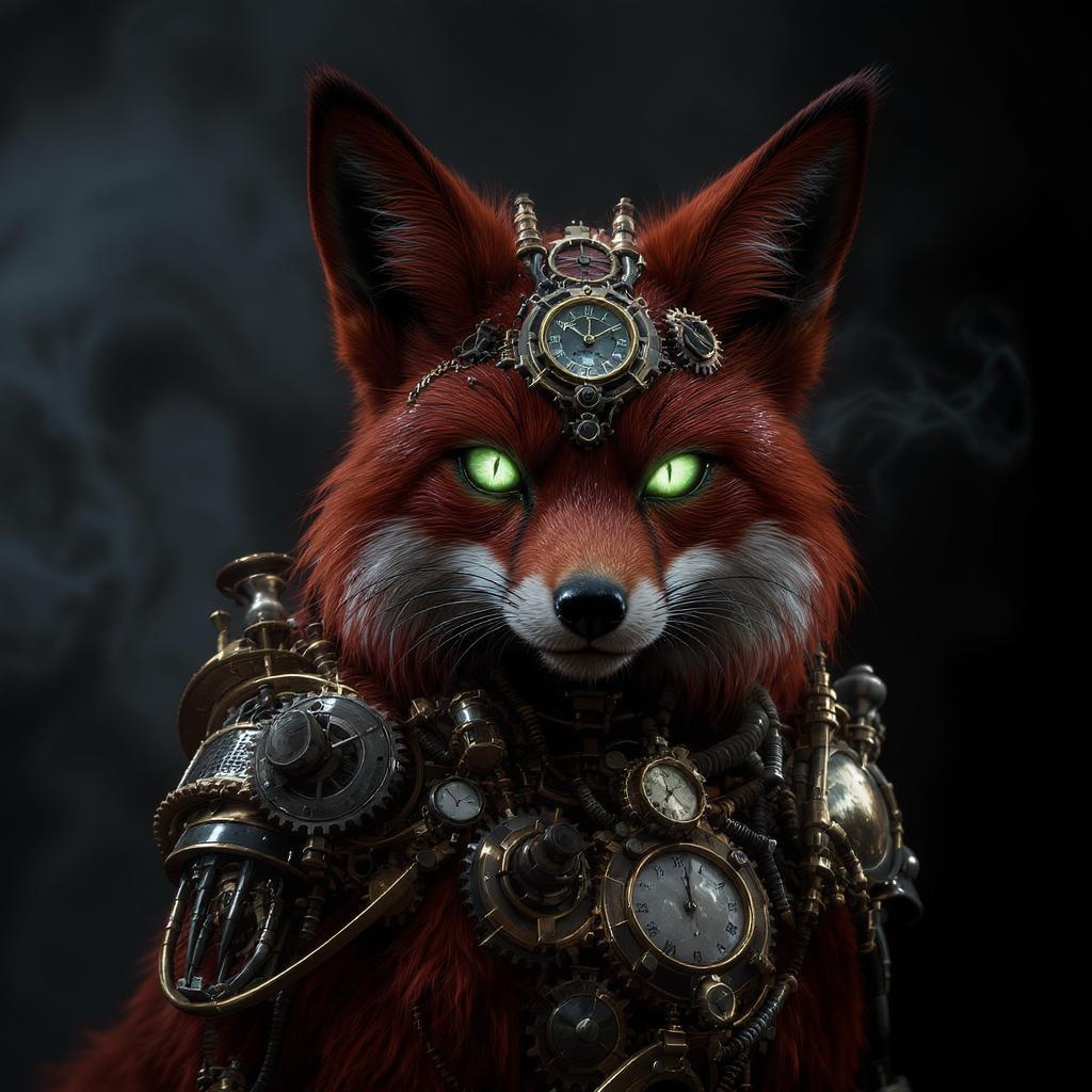 A steampunk red fox with intricate gears and clockwork integrated into its fur, exuding a mystical Lovecraftian aura. The scene features horror elements set in an unreal engine environment, enhanced by ray tracing and hyper details. The setting is moody, with very dark lighting and heavy shadows that add a sense of foreboding. The composition utilizes a wide-angle lens, creating a digital art piece reminiscent of a realistic painting. The portrait captures a DnD-inspired character design, trending on ArtStation. Soft natural lighting combines with dramatic, magic-inspired lighting to highlight the fox's eyes, which glow with an otherworldly energy. Photorealism meets excessive detailing, as the intricate textures of its mechanical elements contrast with its soft fur. The scene is polished with smooth, sharp focus, leverages volumetric lighting, and utilizes cinematic lighting to bring the fox’s enigmatic presence to life.