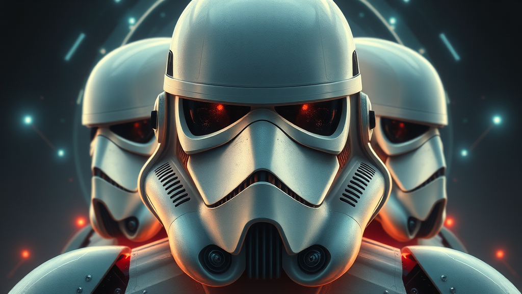 Symmetry portrait of Stormtrooper Star Wars sci-fi glowing lights intricate elegant highly detailed digital painting artstation concept art smooth sharp focus illustration art by Artgerm Greg Rutkowski Alphonse Mucha muted colors soft lighting delicate features harmonious composition futuristic elements refined textures captivating gaze atmospheric depth balanced design ethereal ambiance controlled aesthetic refinement subtle intricacies interconnected patterns timeless elegance imaginative interpretation.