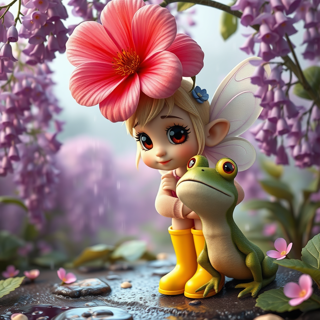 Whimsical enchanting character design 3d octane render, wide shot, charmingly cute petite blossom fairy peeking from behind a vibrant flower as rain drizzles down, wary of a curious frog, picturesque landscape adorned with wisteria blooms, spring vibes, bright yellow rain boots, large expressive eyes, critically acclaimed, hyper-detailed, octane render, dramatic lighting, intricate details --ar 9:16 --s 1000.