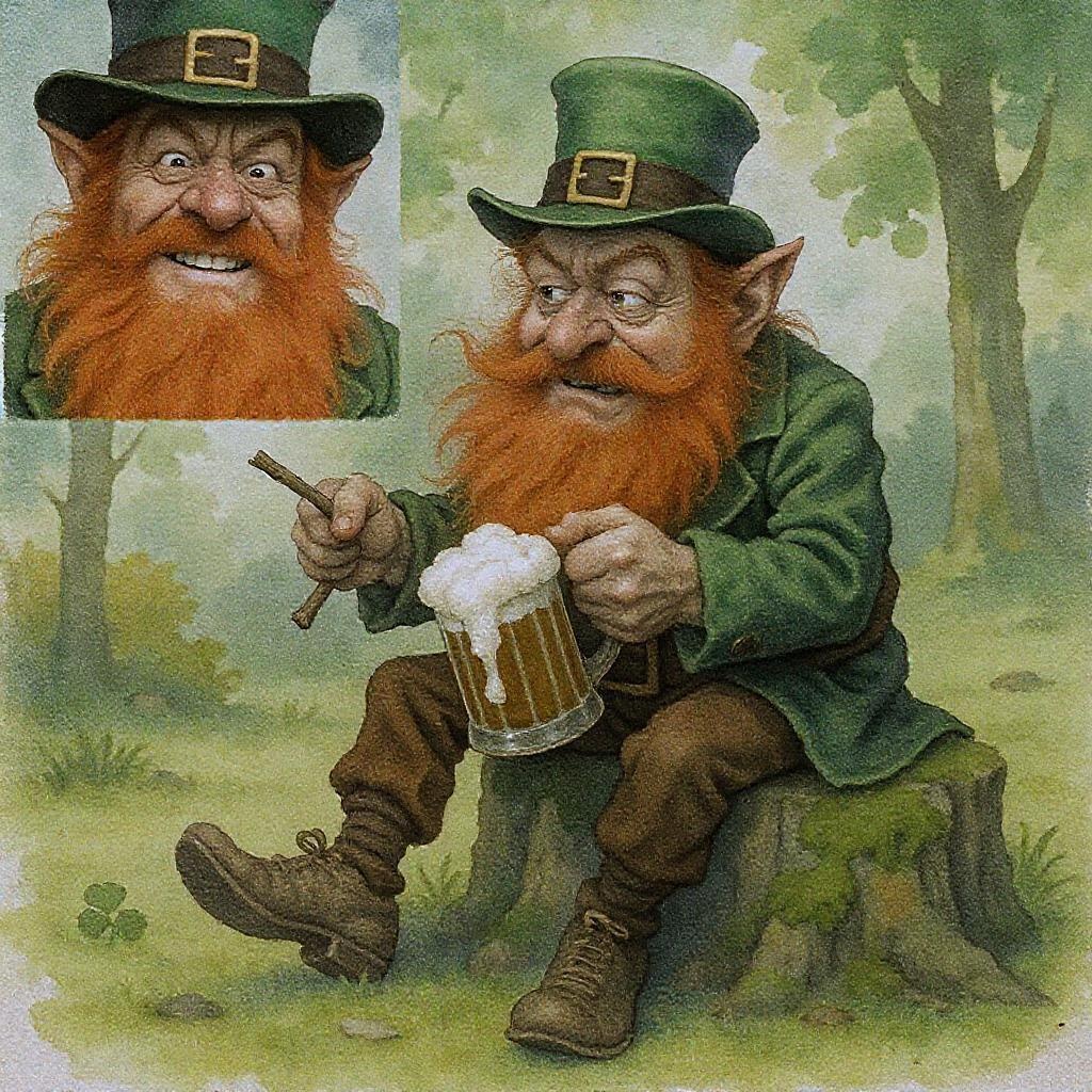 An unusual leprechaun with a wild red beard clutches a mug of frothy beer in one hand while comically whacking himself with a twig in the other, seated on a mossy stump in a whimsical forest. This scene is captured in a watercolor illustration reminiscent of Herluf Bidstrup's style, embodying the playful spirit of St. Patrick's Day with a nod to Weird Al Yankovic's eccentricity. The image, reflective of the grainy charm of early 2000s photography, presents a hyperrealistic, highly detailed portrayal, with close-ups that emphasize the unique textures and expressions on the leprechaun's face. This digital art piece, trending on artstation, captures both a headshot and bodyshot with exceptional attention to detail, enhancing the peculiar charm of this mythical character.