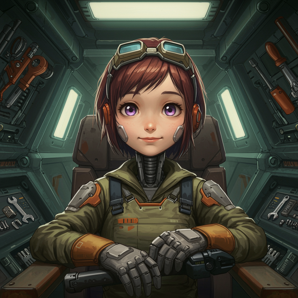 A cinematic close-up shot captures a young mechanic girl with a cute, happy, and energetic expression as she enjoys her afternoon. Her face is highly detailed, with a focus on her innocent eyes, nose, mouth, and lips. She sits confidently in an ultra-detailed mechanic interior that exudes a dystopian feel, surrounded by mechanic tools like wrenches and screwdrivers. The 2D vector illustration is rendered in vibrant colors, showcasing the girl's detailed features against the intricate backdrop. Inspiration from "Ghost in the Shell" adds a futuristic edge to the scene, while maintaining the essence of a beautifully crafted, stunning masterpiece. The cinematic and artistic composition brings together the mechanical and human elements in harmony, creating an image that is both captivating and richly detailed.
