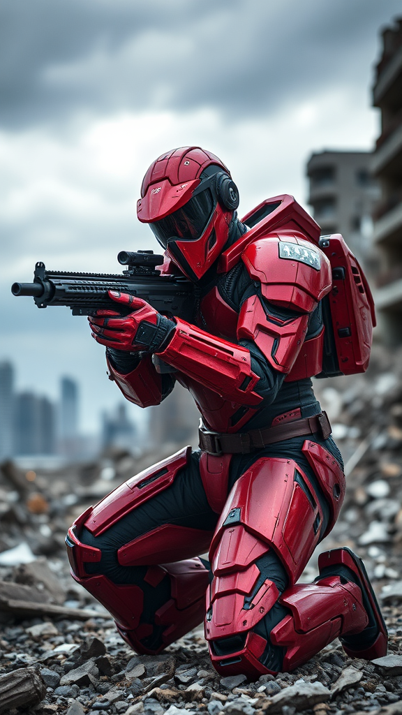 A red-armored female warrior clad in intricately detailed sci-fi battle gear kneels in a tactical position, targeting with precision. Her cybernetic helmet with a sleek visor shields her bald head, while a mask conceals her features, enhancing the enigmatic aura. The weapon she wields gleams with futuristic design, poised for action as she remains focused. Her plate armor, resembling a high-tech spacesuit, displays impressive craftsmanship with numerous complex details. She stands amidst the rubble of a once-vibrant city, now reduced to ruins under an overcast sky. The scene exhibits photorealistic quality, capturing natural textures and the subtle play of natural light with cinematic grace. The moody atmosphere is augmented by skilled cinematic lighting, rendering a third-person perspective with a long exposure blur effect. Shot in 8K Ultra-HD resolution, the image achieves a top-tier cinematic composition, enhanced by ray tracing for supreme realism.
