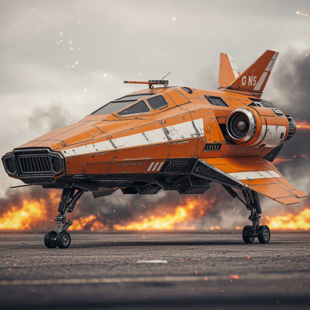 Futuristic spacecraft blending elements of a military jet, featuring metallic orange body with matte black and white accents, exuding luxury and sophistication. Highly detailed with 8k sharp focus, showcasing a full wide photo shot in an ultra-photorealistic style. Inspired by Sci-Fi, it portrays a slightly blurred effect as if in motion. The craft's anatomy is unique, blending realism with imaginative design. It touches the ground on wheels, resembling an airplane ready for takeoff amidst a fiery battlefield warzone. While emanating an aura of authenticity, it carries an intentional touch of artificiality, akin to a polished model or toy, reminiscent of LEGO constructions, embodying an untamed and unconventional artistry.