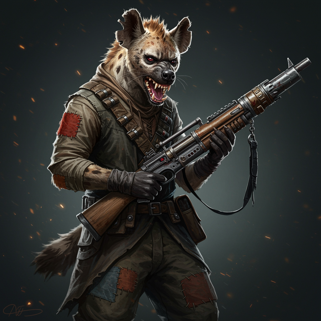 A sinister hyena rebel clad in patchwork clothing, gripping a uniquely modified rifle, anthropomorphic features, highly detailed, ultra high definition, 8k resolution, lifelike representation, intricate facial expressions, dramatic cinematic lighting, vertical orientation, high quality rendering, enhanced artistic style to capture intense mood.